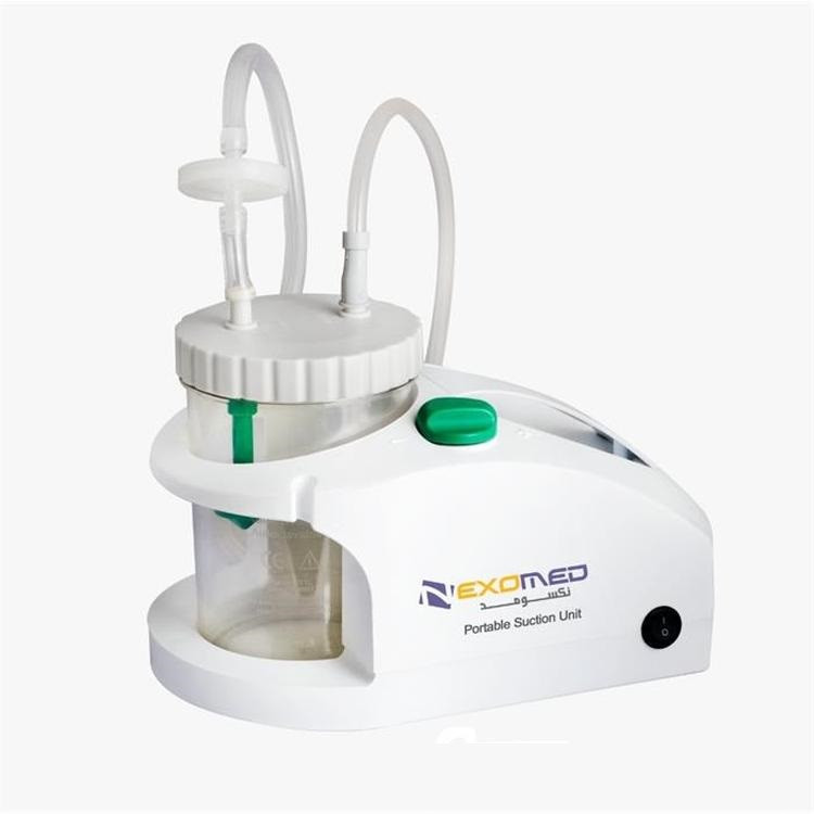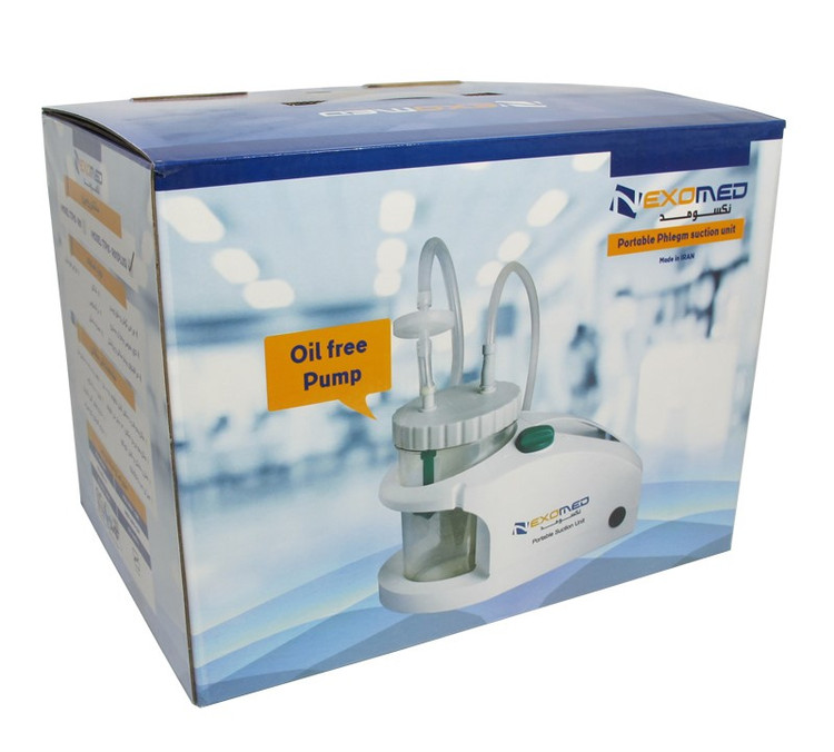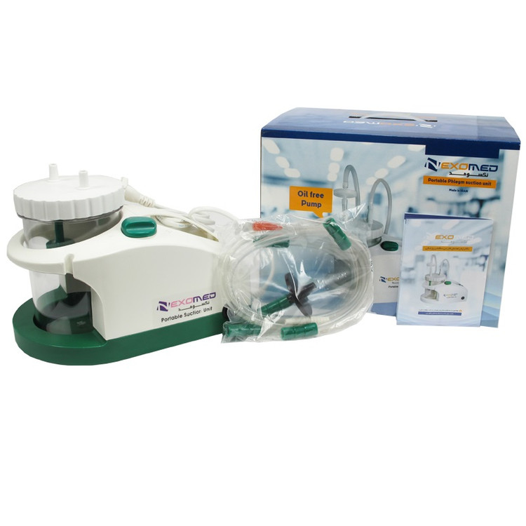 دستگاه ساکشن رو میزی پرتابل نکسومد ساخت ایران می باشد. این دستگاه تک شیشه ،دارای فیلتر آنتی باکتریال جهت جلوگیری از انتقال باکتری ها و نیز دارای جار یا محفظه جمع آوری مدرج و شفاف از جنس پلی کربنات که نشکن و قابل اتوکلاو کردن هست ، می باشد. بدنه دستگاه به رنگ سفید می باشد که دارای کلید روشن و خاموش کردن و نیز پیچ تنظیم قدرت مکش می باشد. داخل هر بسته یک عدد رابط ساکشن و یک سوند ساکشن سایز 16 و یک شیلینگ ساکشن می باشد. قدرت بالا و صدای کم و نیز لرزش مختصر و کارکرد آسان از مزایا این دستگاه می باشد. درب جار دستگاه دارای دو ورودی می باشد که یکی مخصوص شیلنگ متصل به فیلتر می باشد که به ورودی که متصل به شناور سبز رنگ می باشد و دومی به شیلنگ متصل به سوند ساکشن که روی درب بیمار حک شده وصل می شود. درب به صورت پیچی سفت می شود. این دستگاه دارای مجوز ساخت از اداره تجهیزات پزشکی ایران و تاییدیه استاندارد ایران میباشد.