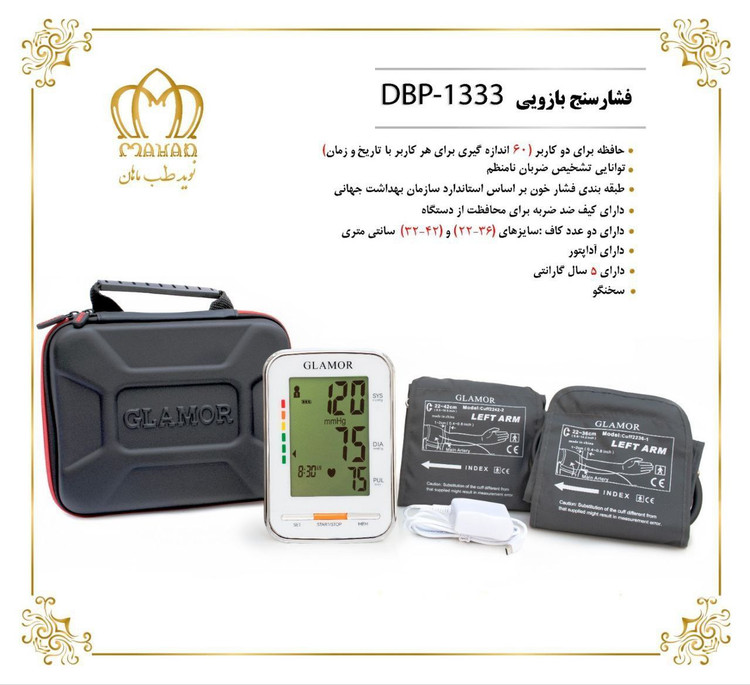 فشارسنج بازویی دیجیتالی گلامور مدل DBP-1333 – سخنگو یکی از محصولات برند معتبر گلامور آلمان می باشد که با مانیتور فشار خون برای اندازه گیری غیر تهاجمی با استفاده از روش اسیلومتریک برای تشخیص فشار خون سیستولیک، دیاستولیک و ضربان قلب در نظر گرفته شده است؛ دقت بالای فشارسنج های گلامور دارای تاییدیه بالینی و تاییدیه EU MDR هستند و برخی از مدل های دستگاه bp دارای تاییدیه ESH هستند، کارکرد خودکار بصورت تمام اتوماتیک بوده و فقط با فشردن یک دکمه انداره گیری می نماید.